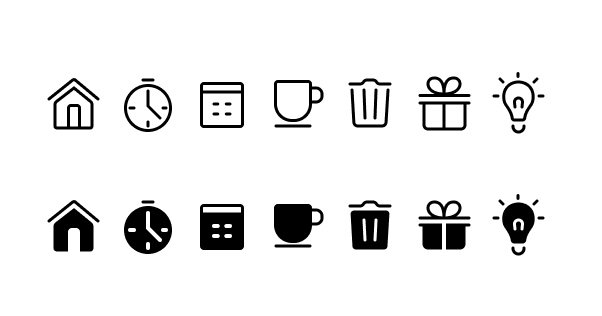 The many use cases of icons can be hard to catoregize for all future instances. For navigation icons, it’s important to keep the styling outlined with filled versions available if needed for selected and unselected states.